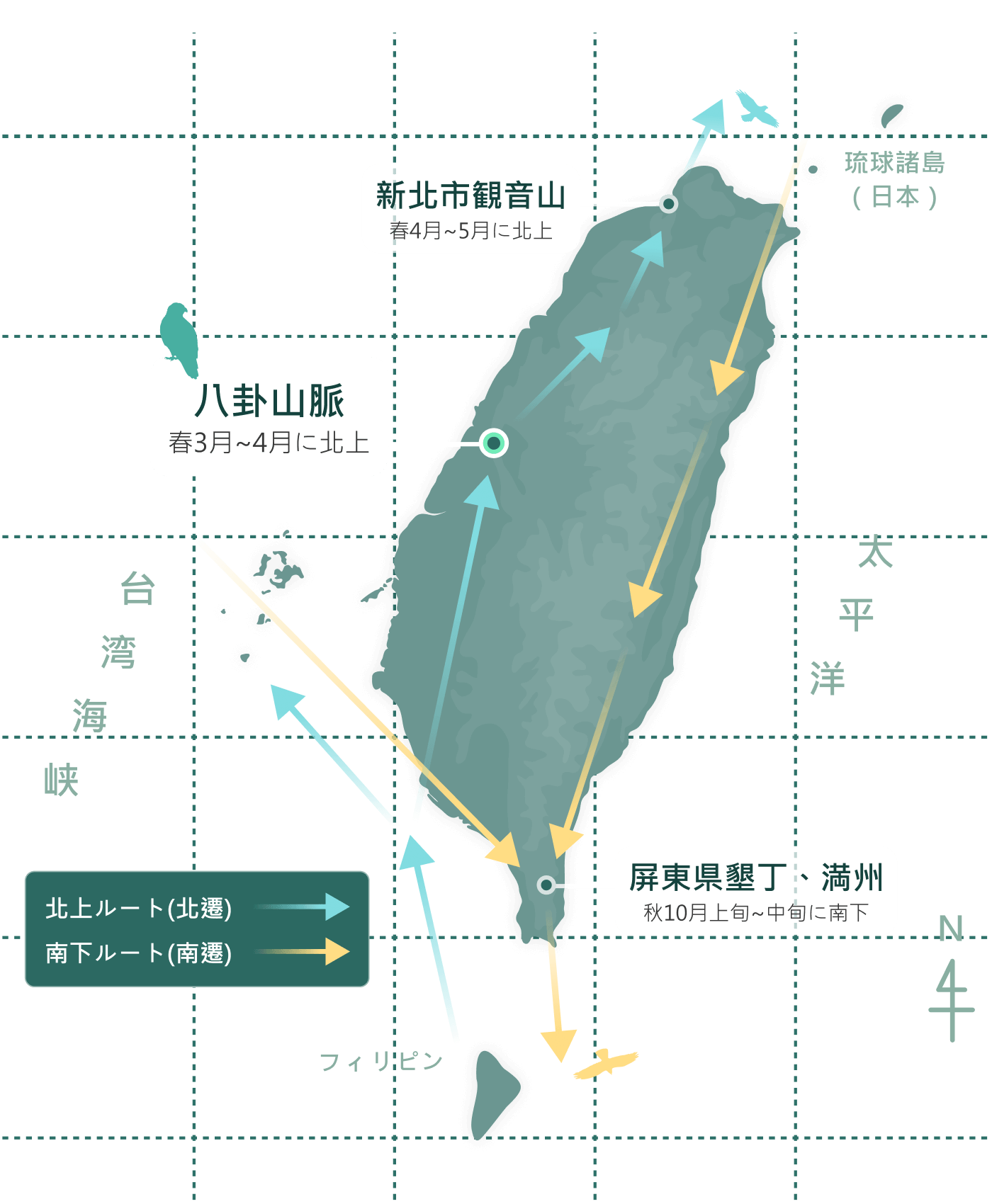 毎年9月に繁殖地から南下し、台湾を経由して東南アジアへ渡り、翌年の春には慣れたルートを平均約9,000 km北上します。その中継地点として重要な位置にあるのが台湾です。