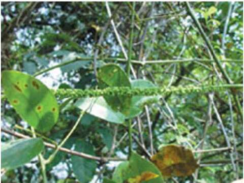 藤坪步道的這棵鴨腱藤,年紀己近百,巨大的螺旋狀莖,就像盤繞於樹林中的巨龍,主莖向山坡上延伸,長達65公尺,分枝難以估計,規模十分壯觀。但可能因為地處北部,它很少開花,開了花也不見得結果,有時候,高高的枝頭上,會看見一個大型莢果,也只能遠觀而無法近瞧。鴨腱藤的種子,在豆科當中算是很大的,客家先民有把種子內部挖空,用來存放葯粉,也有充做撲滿的,手巧的孩子,在上面挖幾個孔,甚至可以當樂器呢!