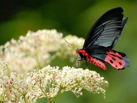 美麗的曙鳳蝶喜歡生活在高山中,每當清晨曙光剛登上山頂的一剎那,就能看見曙鳳蝶已在花叢間翩翩飛舞,「曙鳳蝶」之名由此而來,黑紅相稱的曙鳳蝶在金黃色曙光相映下,有如飛舞在山巔上的美麗仙子!梨山地區更是在每年的7至9月間,常常可在蜜源花叢上遇到牠穿梭飛舞,由於牠翅膀上的花紋有類似西瓜子的黑斑,所以又被戲稱為"西瓜蝶",這麼有趣的名字。想一睹牠美麗的風采,歡迎您到梨山風景區,一起尋找牠在冇骨消等花叢間採蜜美麗的芳蹤。