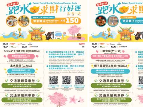 免開車的輕旅行只要銅板價,本處攜手在地商家,針對「台灣好行跑水求財線」推出兩種超值優惠套票遊程,整合交通、餐飲及手作DIY,可以玩田中、二水或南投竹山,通通只要150元。即日開賣,限量400套,售完為止。