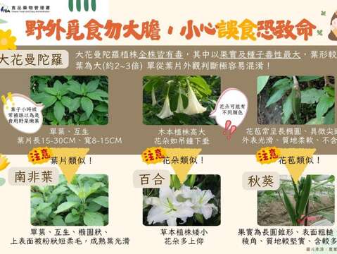 衛生福利部食品藥物管理署「不採、不食野生不明動植物」原則,以降低食品中毒風險宣導