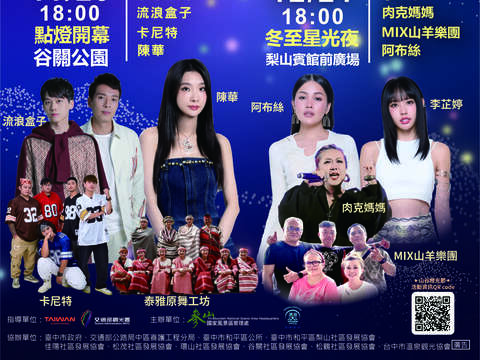 梨山地區今年因圓環公共藝術工程,將在12月21日冬至當天,點亮梨山賓館前兩棵28公尺高的雪松,化身「雲端上的耶誕樹」,冰柱燈與流星燈管妝點,搭配聲光展演效果,打造高山夜色中最亮眼的焦點。點燈活動將邀請李芷婷、阿布絲、肉克媽媽及MIX山羊樂團等演出,活動精彩可期,邀請國內外遊客上山賞燈、拍照打卡,並品味梨山盛產的甜柿、雪梨及蜜蘋果等高山美味。梨山光環境燈區則自114年12月21日至115年1月25日止,遊客賞楓、賞燈、品嘗蜜蘋果、梨山甜柿正是時候。更多活動詳情請至臉書粉絲專頁「參山國家風景區管理處」查詢。