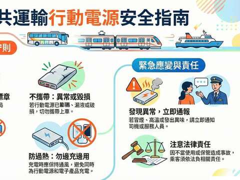 四、 發生異常時怎麼辦:若發現行動電源冒煙、過熱、異味或起火,請立刻通知車長、服務人員或駕駛,並配合處理。