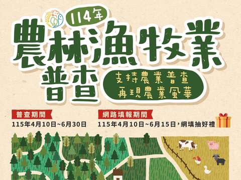 114年農林漁牧業普查將於115年4月10日至6月30日進行普查,網路填報時間為115年4月10日至6月15日止,網路填報還能抽好禮,更多相關資訊請至