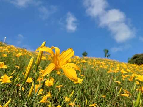 曹處長說,往年經驗第一朵金針花開之後,預計再2個星期就會進入盛開期,相信4月中旬大家就能看見金針花滿山綻放。本處也在「趣遊參山」臉書粉專舉辦留言預測第一朵金針花開日期活動,要邀請大家一起同樂,活動也會送出喔熊頸枕、金針花精油手工肥皂組等好禮,歡迎大家趕快到參山臉書專頁留言,來猜猜第一朵金針花何時會開。本處說,雖然每朵金針花只能美麗綻放一天,但虎山巖金針花在5月還有第二期爆開潮,大家把握賞花時間到花壇賞花吃美食,買農特產,體驗休閒農業小旅行。