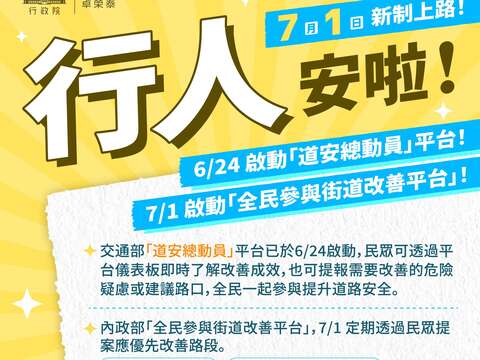 卓榮泰在臉書發出指出,七月新制上路,趕緊照過來看覓。首先是「行人安啦!」,包括「道安總動員」平台已上線,全民了解各地道安成效,及一起提報改善路口;「全民參與街道平台」上線,民眾可提案優先改善街道,一起打造人本交通環境。