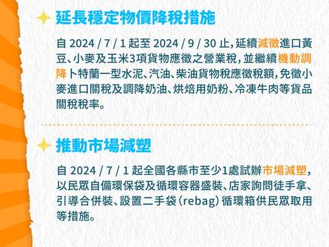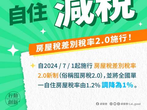 「減負擔!」:包括房屋稅差別稅率2.0上路,全國單一自住房屋稅率調降為1%;延長關鍵原物料稅負減徵措施。