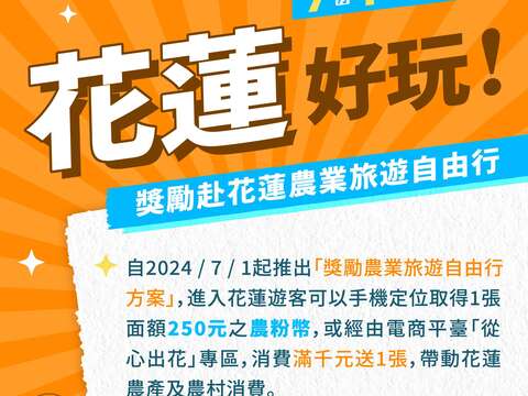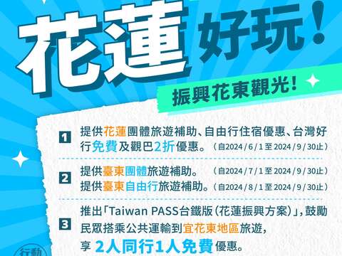 「花東好玩!」:包括花東團體旅遊補助、自由行住宿及交通優惠;「獎勵農業旅遊自由行方案」,提供進入花蓮遊客面額250元農粉幣;Taiwan PASS 台鐵版,宜花東旅遊兩人同行一人免費。