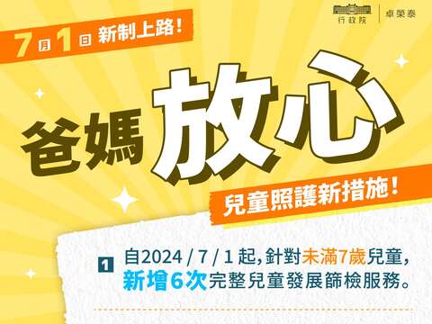 7月起有多項攸關民眾權益的新制上路,包括「道安總動員」平台上線、 花東團體旅遊補助、自由行住宿及交通優惠、房屋稅差別稅率2.0上路、未滿7歲兒童新增6次完整兒童發展篩檢服務等等,行政院長卓榮泰也在臉書po出新制圖卡,透過簡單明瞭方式,讓民眾容易了解各項新制度。