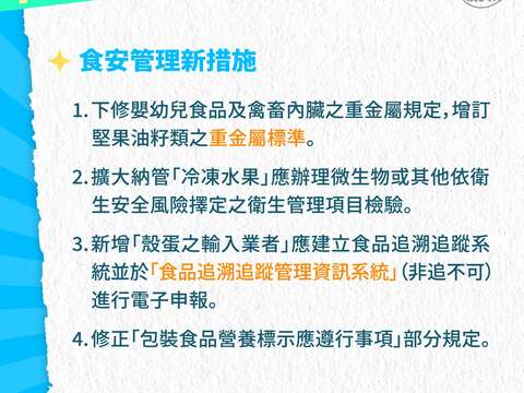 卓榮泰並指出,另外在食安管理上,政府也修正及推出一些新規範,確保更安全的食品衛生環境。他強調,行動創新AI內閣,會持續推出溫暖、便民的政策,照顧每一位國人的生活,讓國人安心。也歡迎大家一起分享 7/1新制圖卡,讓更多人了解政府新措施。