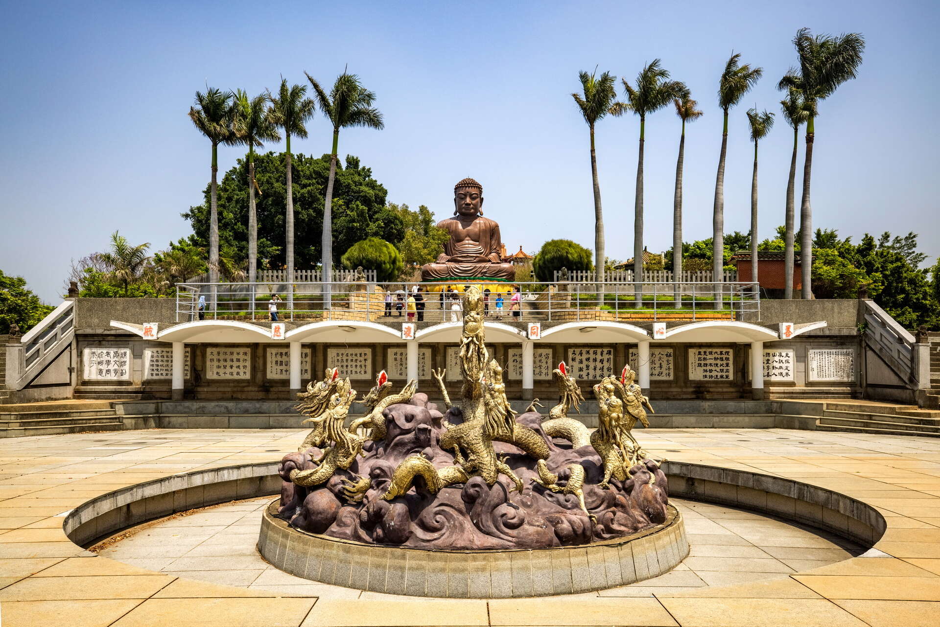 位於大佛像前下方,池中心設有九龍浮雕噴水池。池中整治成水舞表演場,夜間水舞燈火閃耀、水姿搖曳;此外,文學觀景迴廊下方的文化藝廊保存許多知名書法家的揮毫作品可供觀賞,上方270度的環形觀景步道視野遼闊,可遠眺彰化市景及仰望大佛像。廣場不遠處是通往「銀橋飛瀑」登山步道的入口,沿途綠意盎然,是在地民眾健行的好去處。